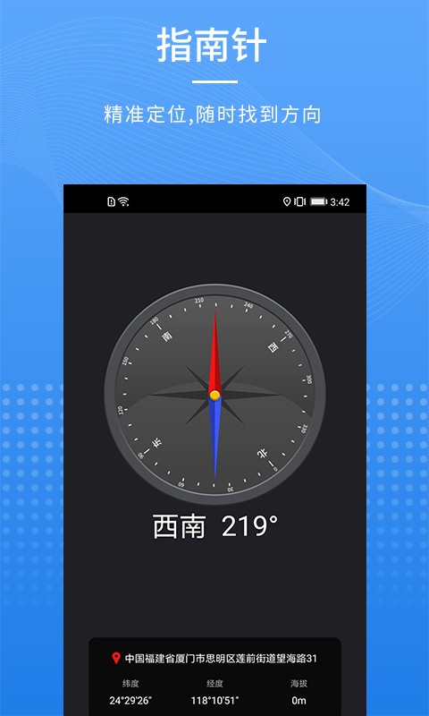 一款旅行的全能指南针,让您随时掌握方向,并可获取当前位置的实时气压、高度、经纬度等信息!