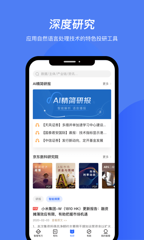 基于京东大数据谱系与机器学习算法提供智能化个性化研究工具、交易工具及风控服务,摆脱金融信息洪流。