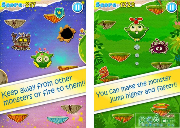 怪兽跳跃(MonsterJump)是一款富有趣味技巧性的简单休闲类游戏。在游戏中你要让角色不停地往上跳跃,在跳跃中要小心破碎的平台、移动的平台、黑洞和怪物,途中有帮助您快速上升的火箭、弹簧、蹦床和竹蜻蜓等道具。跳得越高,分数就越高。游戏特点: