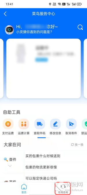 1、打开手机上的菜鸟app(菜鸟裹裹app),在【我的】页面点击【服务中心】;